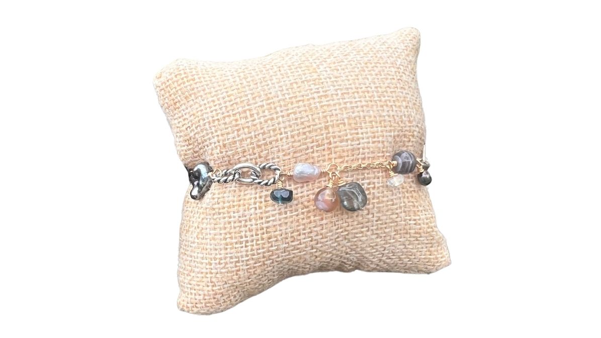 143 Collection Bracelet in 14K gold fill and Sterling Silver with Tahitian and Wild Keshi Pearls and gemstones; Botswana agate, Topaz, Moss Aquamarine & Moonstone