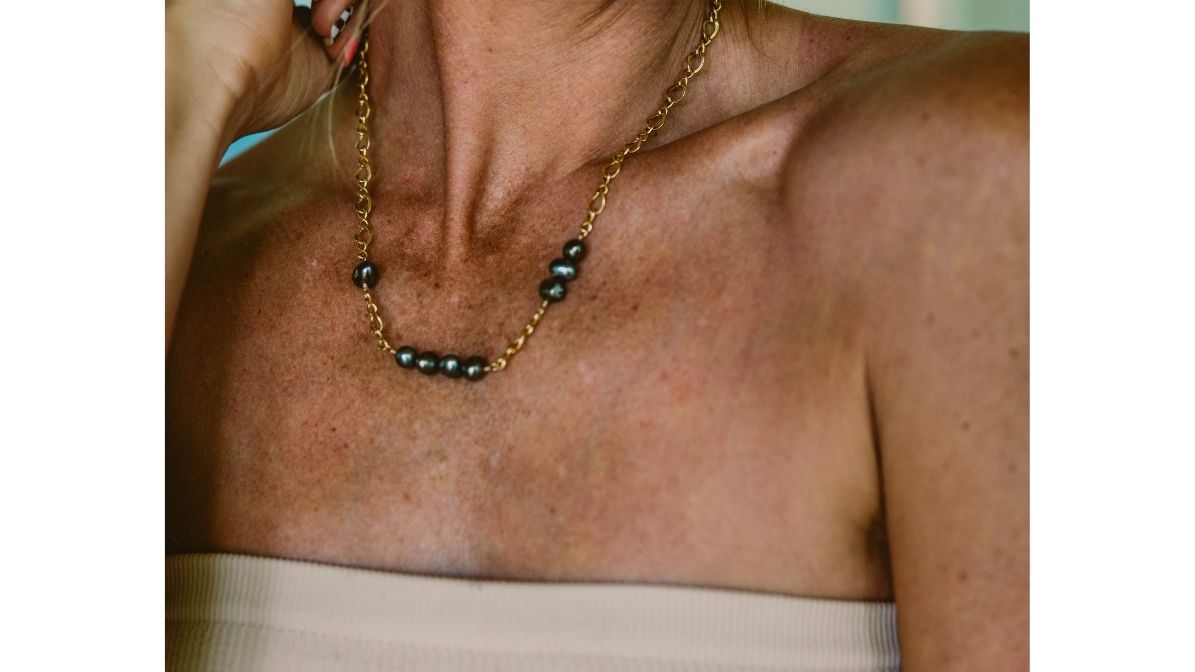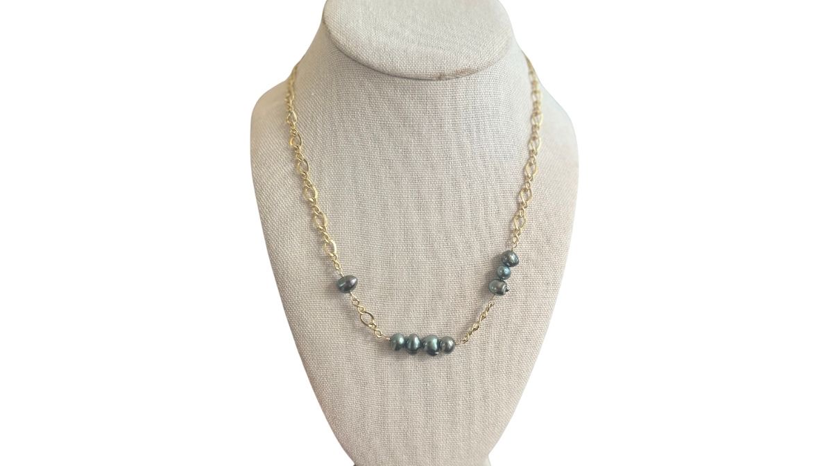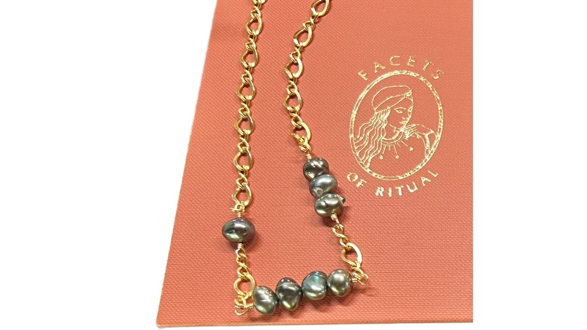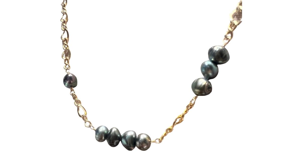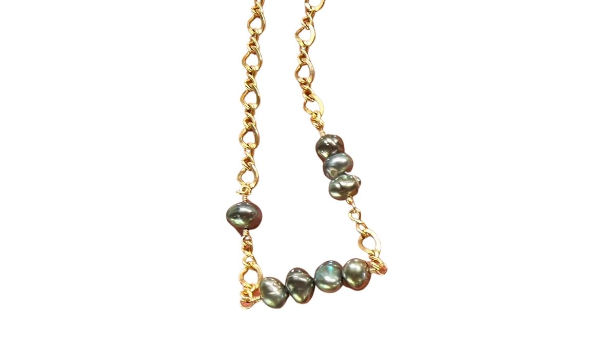 143 Collection Necklace in 14K gold fill chunky infinity chain featuring Tahitian Keshi peacock lustre pearls