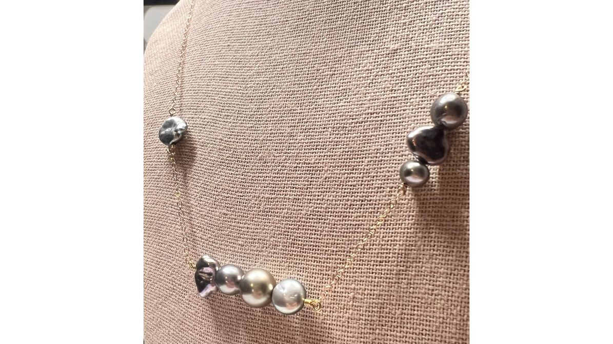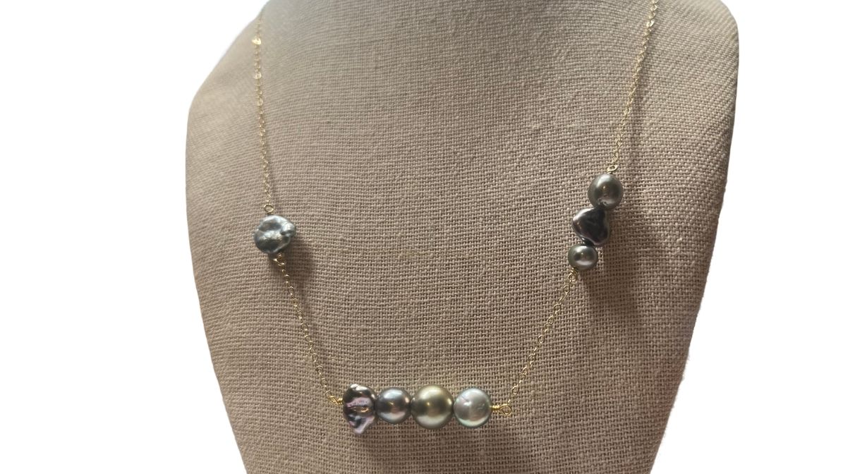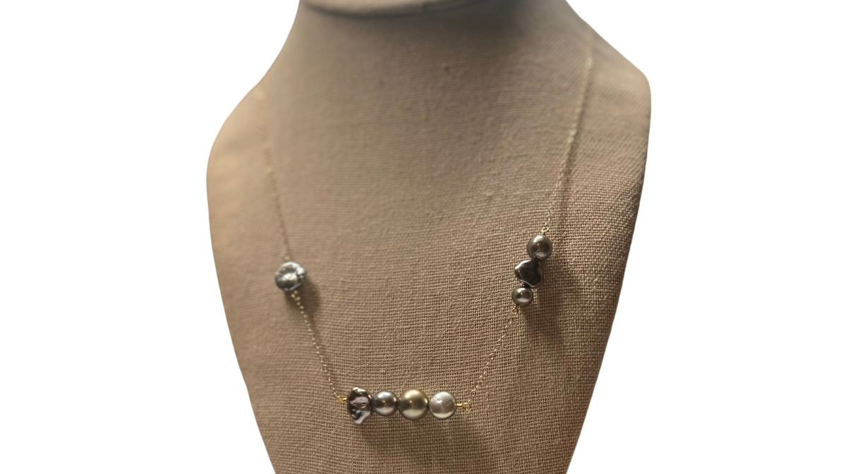143 Collection Necklace in solid 14K yellow gold cable featuring Tahitian Keshi Pearls and Bronze round Tahitian Pearl
