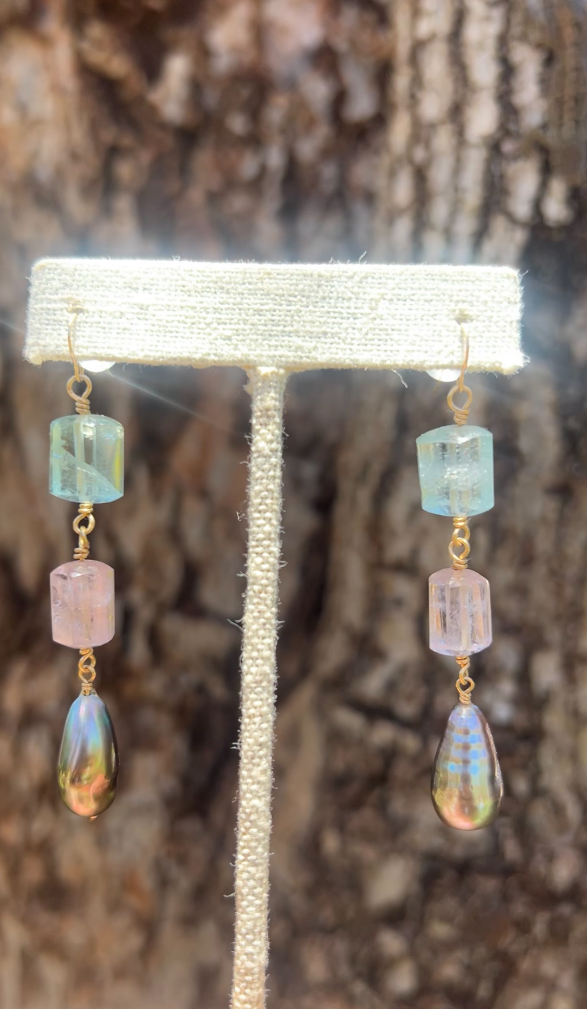 14K Yellow Gold with fancy cut Aquamarine and Morganite which are both in the Beryl family, also featuring X-Large Tahitian Keshi Pearls which took over 5 years to develop. Keshi pearls are non-nucleated, resulting in organically shaped nacre growth. The lustre on these particular pearls are intense purple, pink, green and blue.