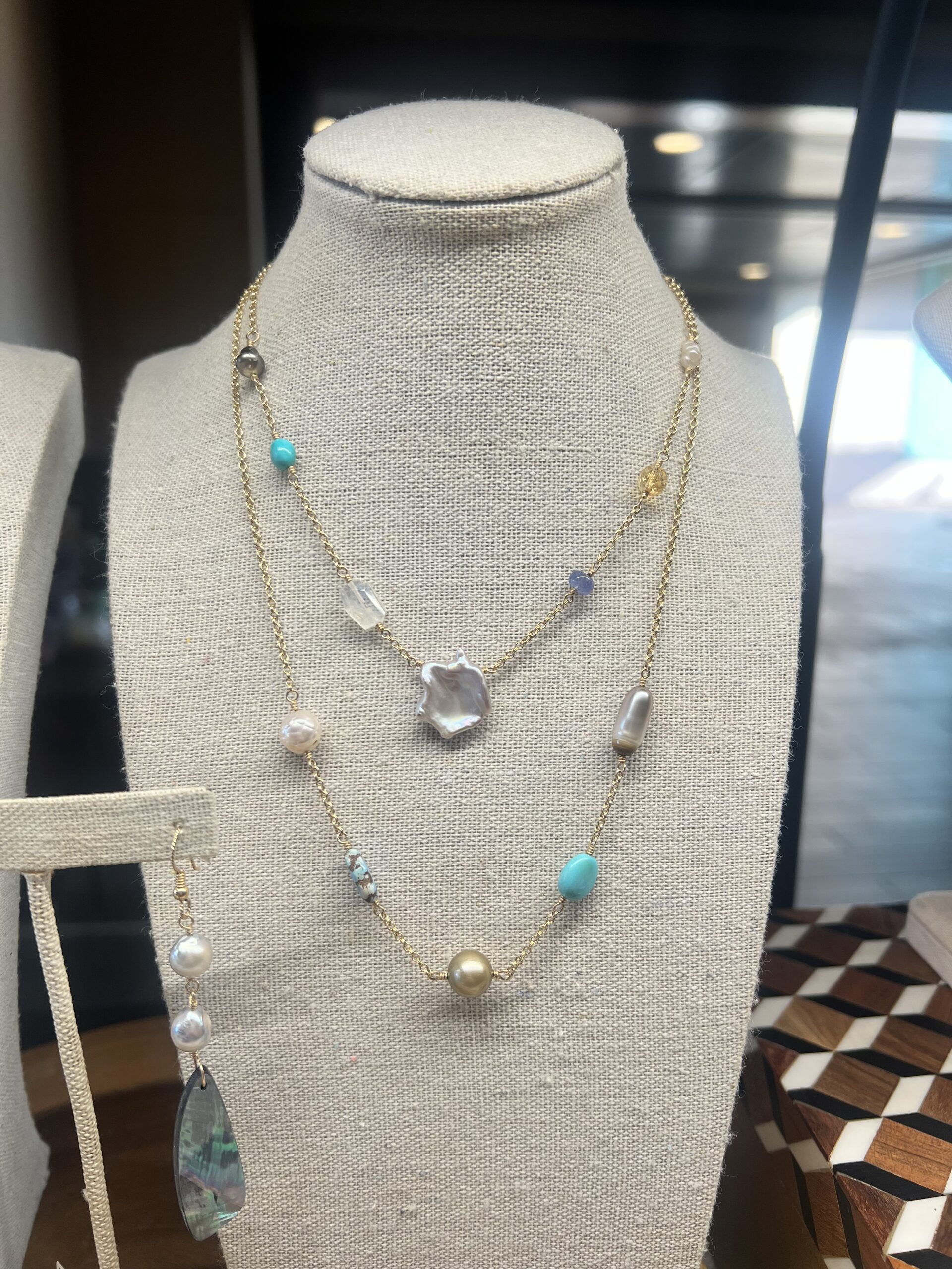 14K Gold Fill double rollo chain featuring 9mm natural bronze taupe Tahitian pearl, silver Tahitian Keshi, faceted FW pearl & Sleeping Beauty RARE Golden Hill Turquoise