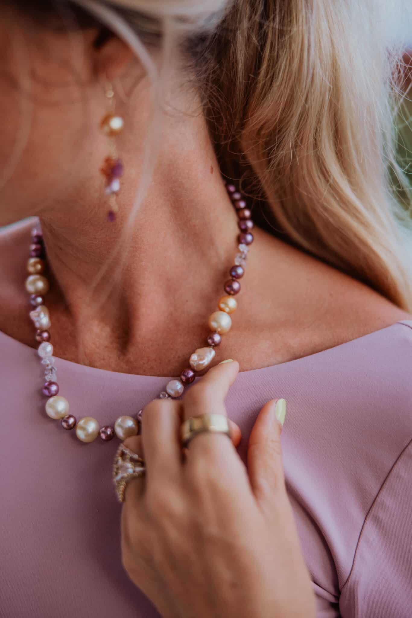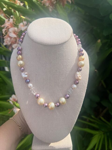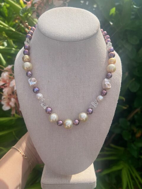 Champagne and Gold South Sea Pearls with Pink Metallic Edison Pearls, X-large Edison pearl keshi pearls, faceted Freshwater pearls and Herkimer Diamonds hand-knotted on silk with a 14K gold-fill lobster claw clasp.